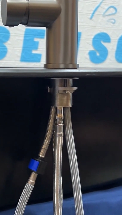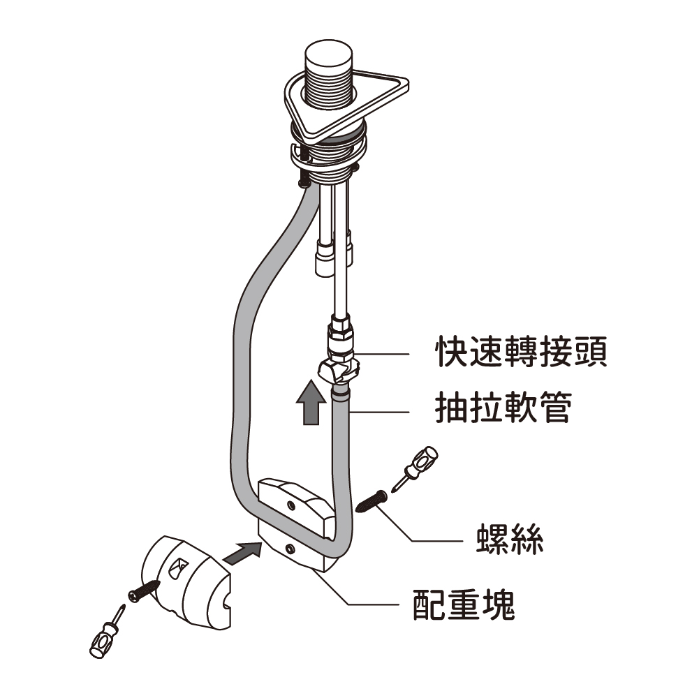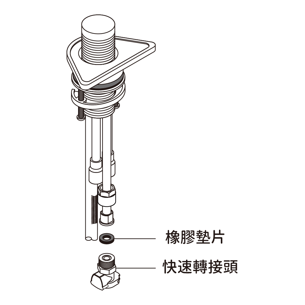 將橡膠墊片與快速轉接頭鎖附在龍頭底下金屬管。