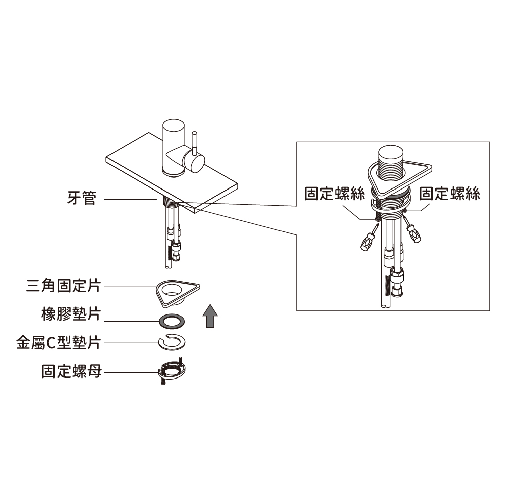 金屬C型墊片、固定螺母依順序鎖在牙管,