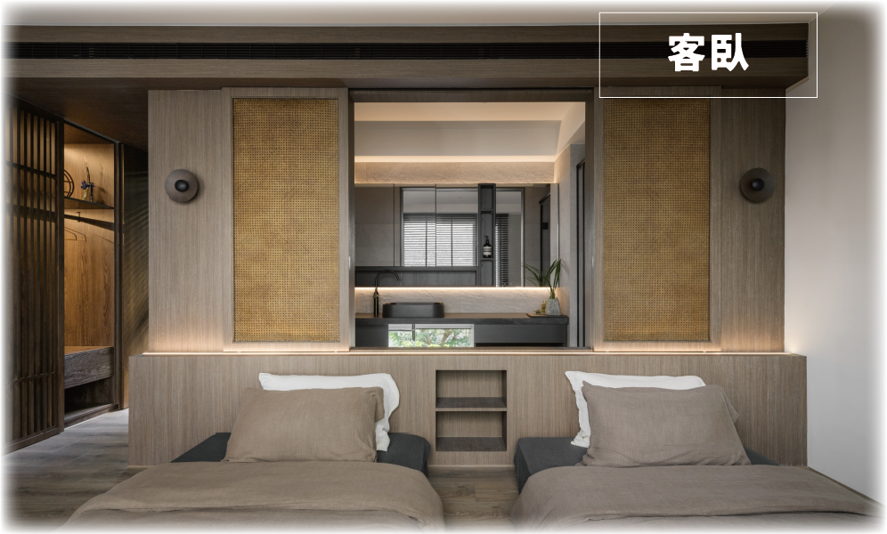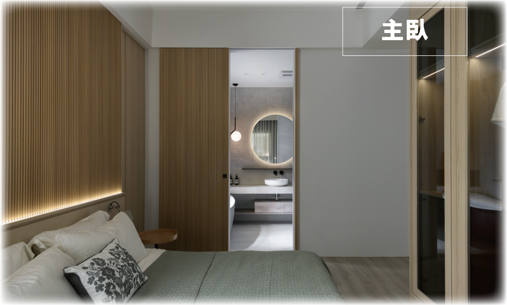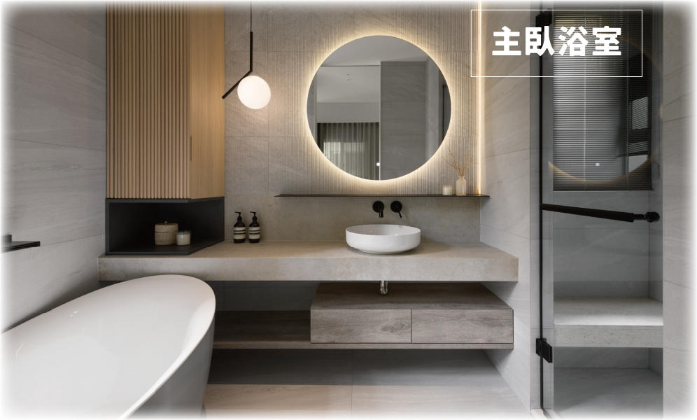 〃浴室則選擇灰白色瓷磚與原木櫃作點綴,搭配白色燈光,簡潔明亮。
